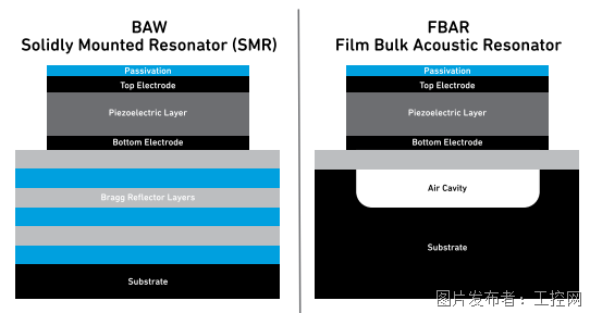 BAW滤波器:BAW滤波器最基本的结构是由两个金属电极夹着一层压电薄膜,让声波在压电薄膜内部振荡形成驻波。与SAW不同的是,SAW是声波在表面上传播,而BAW则是声波在腔体内垂直传播(如图5所示)。与FBAR不同的是,BAW利用布拉格反射器叠层使声波信号保持在叠层的内层,并与原来的波叠加后反射到压电层中,这种结构称为BAW–SMR(固态装配谐振器),而FBAR则是利用一个空气腔来做声波的反射振荡。图6说明了BAW-SMR与FBAR的结构差别。