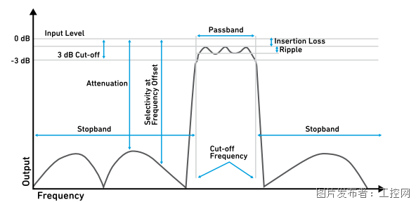 图7为典型的滤波器工作响应。滤波器的关键参数关系到无线射频系统的传输质量与效率,表1列出了滤波器的关键参数以及选择一个好滤波器的标准。