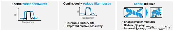目前Qorvo的BAW滤波器工艺已处于第六代水平,简称BAW 6,完全是由Qorvo独立自主开发与量产制造。目前针对Wi-Fi 6E与Wi-Fi 7路由器所设计的滤波器都是以BAW 6工艺为主。越高端的BAW工艺具有越好的边带(edge band)抑制能力,支持更宽频段的滤波性能、更低的插入损耗,并且能够实现更小的裸片尺寸。图9展示了Qorvo BAW技术的演进过程,以及不同工艺对滤波器插入损耗和裸片尺寸的影响。