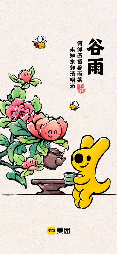全速为美团打造二十四节气插画海报设计,以仿水墨风的国画小品风格展现节气特有民俗及物候,用“长是江南逢此日,满林烟雨熟枇杷”等诗意短句注入文化内涵,并结合动效设计将迷你版美团IP“袋鼠团团”融入微观场景,让品牌标识自然植入生活画面,营造一种温暖氛围,提升用户对品牌的好感度。